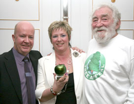 Bee Aware founder Judith Wright accepted a prestigious environmental award at a glittering ceremony onboard the Royal Yacht Britannia. A special Gold Award was presented to Bee Aware in the 2009 Green Apple Awards for retail organisations. The award recognised Bee Aware’s important work with shopping centres throughout the country. The presentation took place in the spectacular setting of the Royal Yacht Britannia which is permanently moored in Edinburgh. Judith is pictured with her husband Bob and Professor Bellamy.